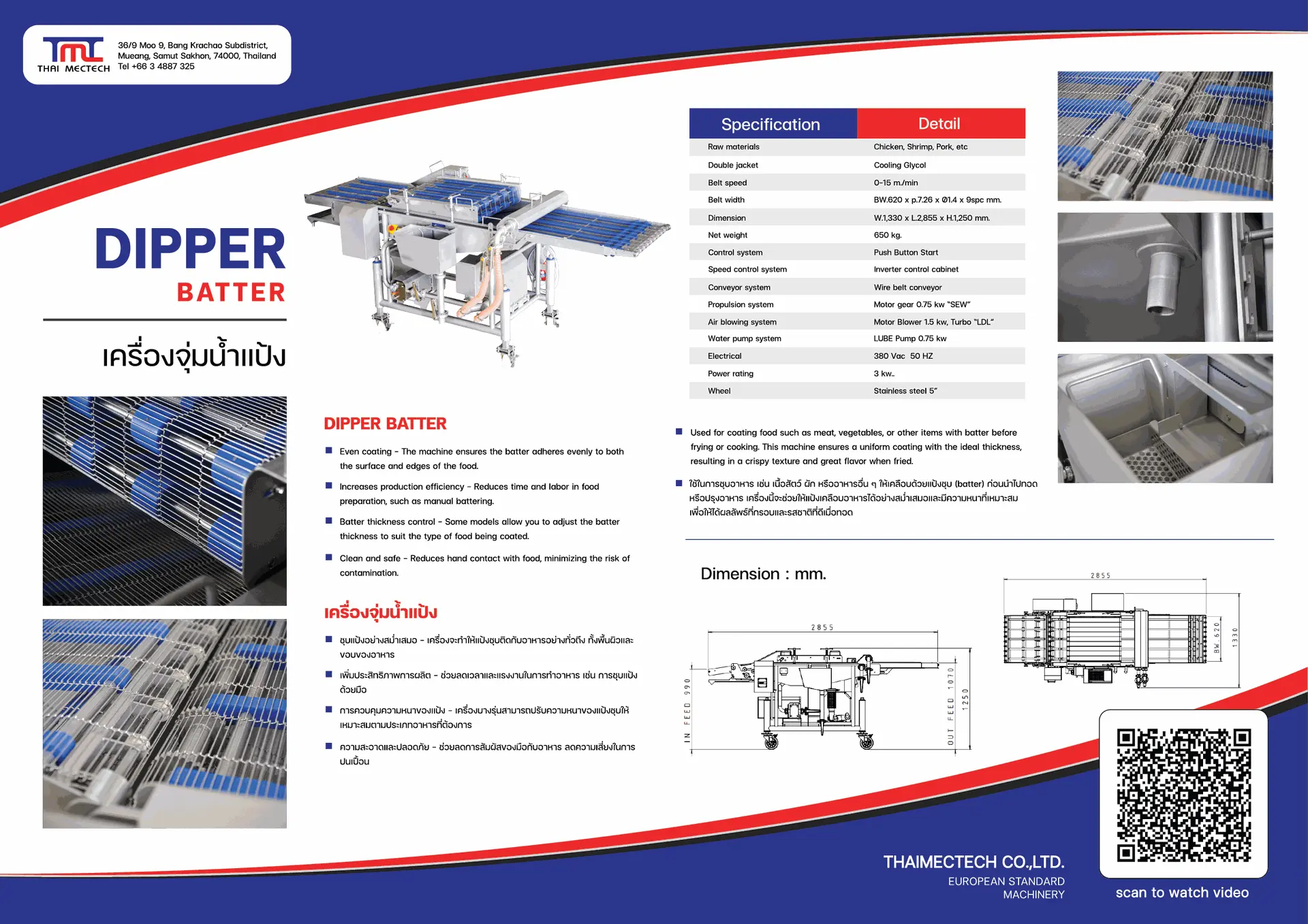 A machine that can be used with a variety of products such as chicken, shrimp, fish. The machine can be easily disassembled and cleaned. Suitable for the frying line of a cooked food factory. FurtherDesigned according to the good hygiene principles of the GMP&HACCP factory.